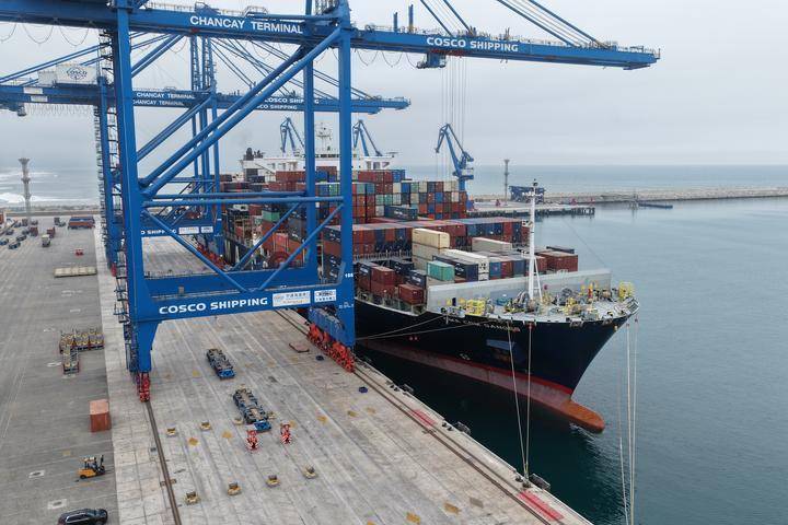 8月28日,在秘鲁钱凯港码头,集装箱船靠港装卸。新华社发(伊万·帕斯摄)“此次我们运抵上海的首个集装箱,正是通过钱凯港启运的。”她说,“现在货物从秘鲁到中国只需不到30天,航程缩短大约15天,这对保质期有限的食品而言十分关键。同时运输成本降低,也让我们在中国市场更具竞争力。”